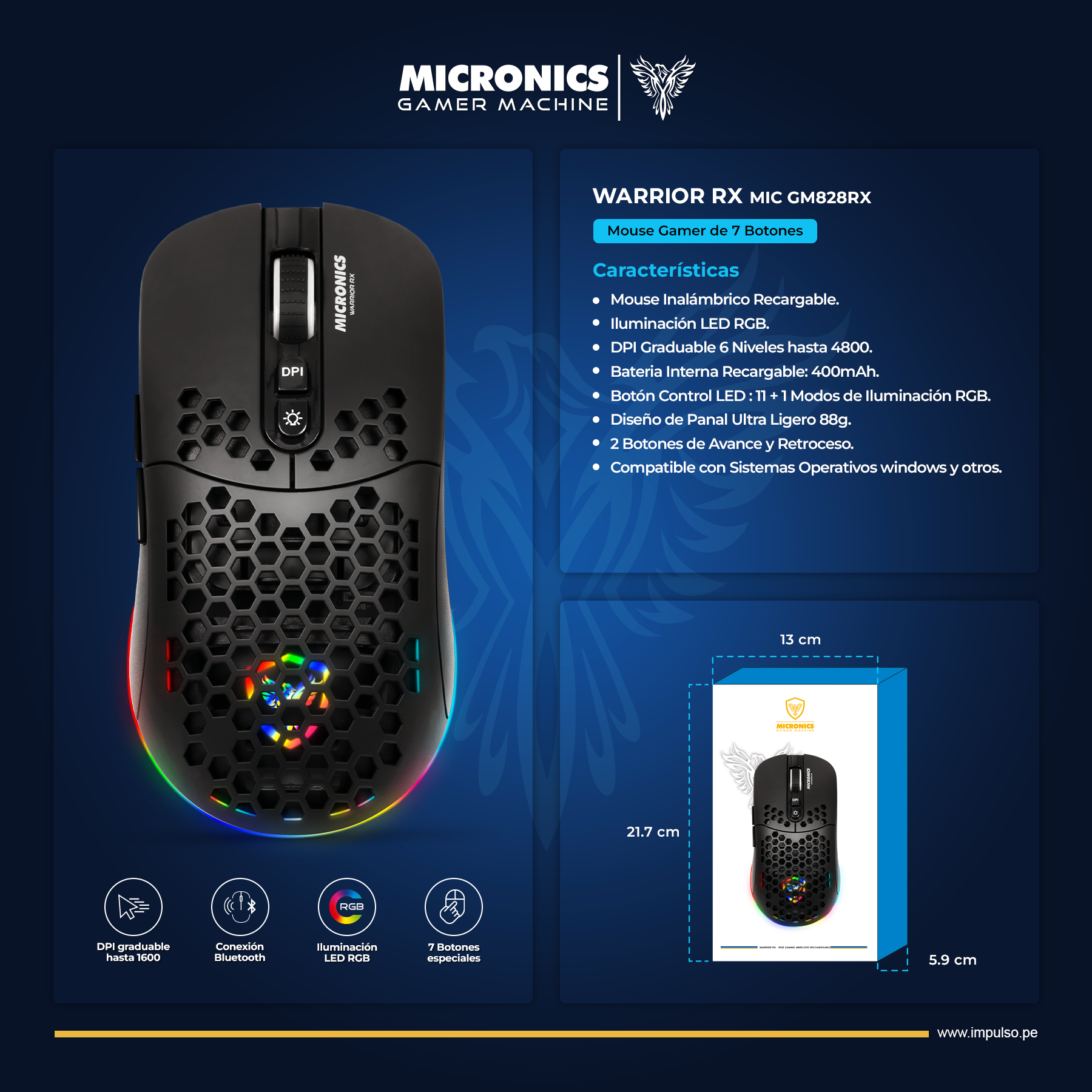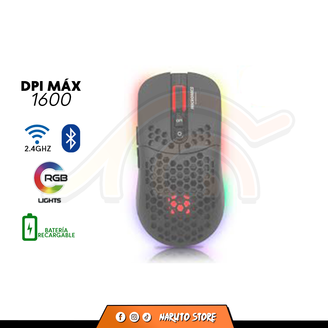 MOUSE MICRONICS WARRIOR RX – MICGM828RX | INALAMBRICO | 1,600 DPI | RGB | NEGRO